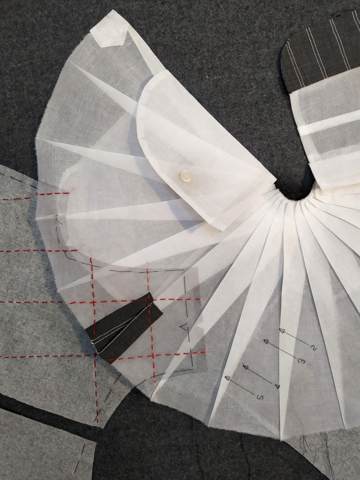 Cutting, tacking and construction techniques all feature strongly in the exhibition, whether based on imagery of tailoring, or branching into new directions. Stitches themselves become a new language of mark or construction.