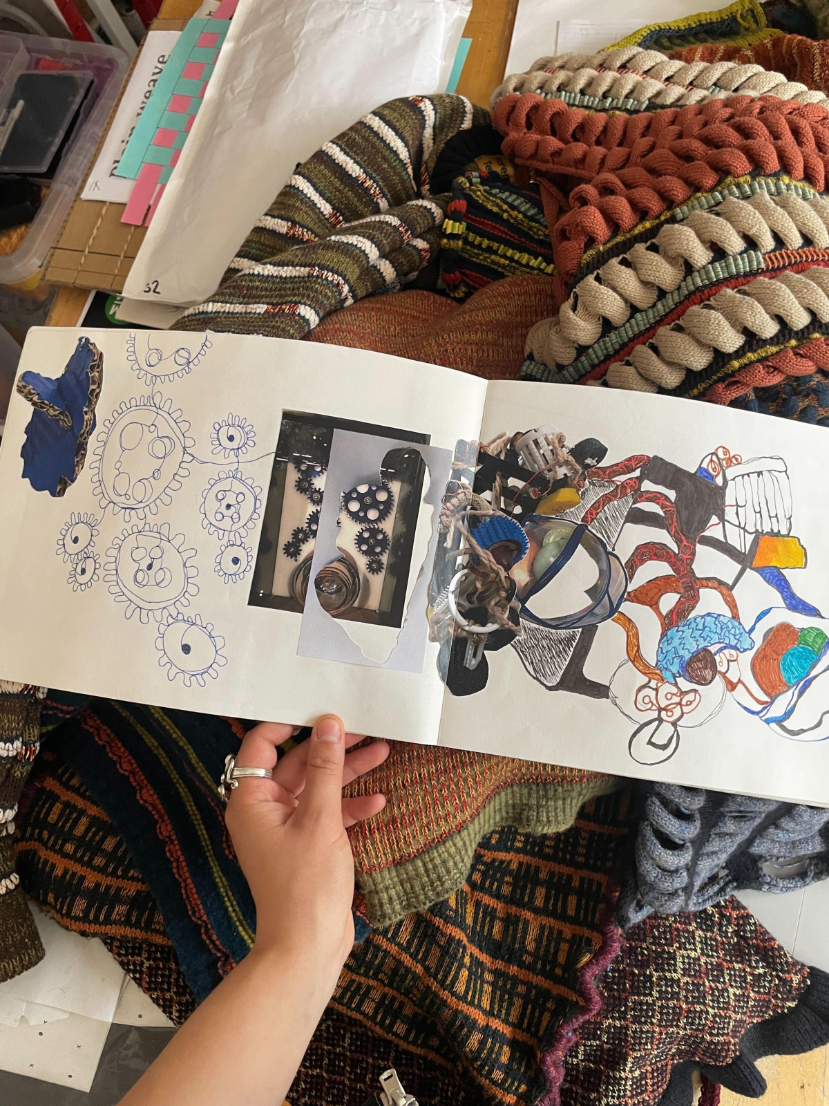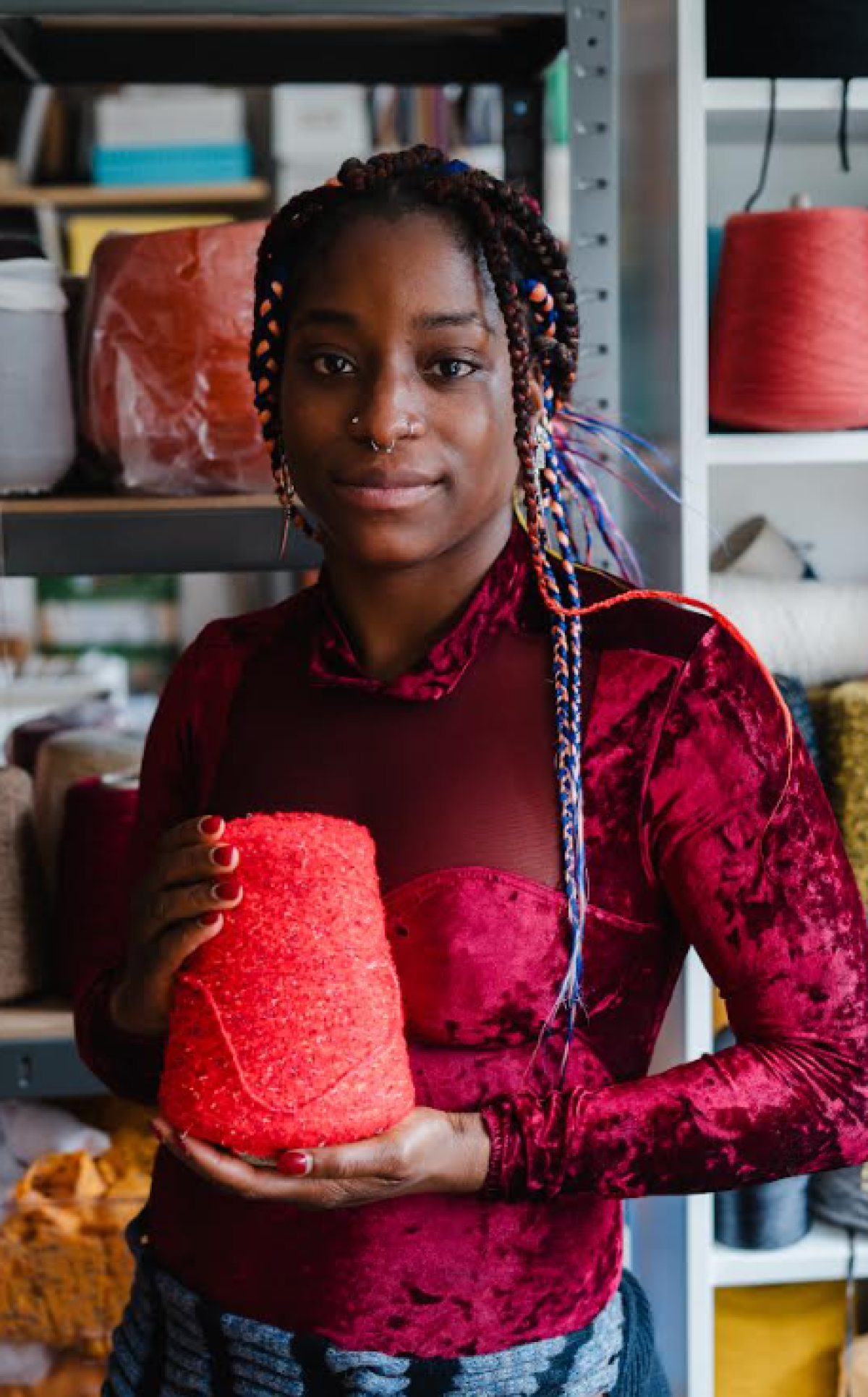 Guided by a zero-waste practice, Kemi sources all materials from deadstock suppliers. Each piece begins as a small knitted sample, allowing her to refine colour, texture, and pattern before creating the final work.