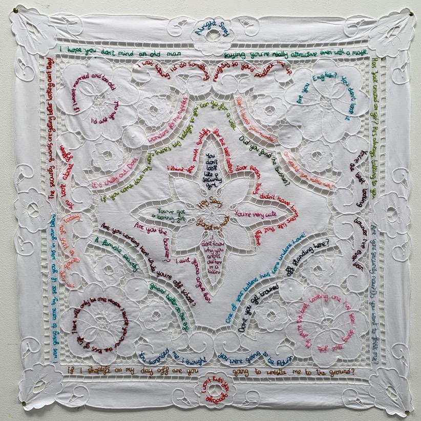 Covid Customers is a compilation of the remarks that were made to me, by men in my workplaces. These situations left me with the conflict of being at work, trying to stay professional whilst seething inside. The embroidery acts as a release, a way to portray what has been said to me.
