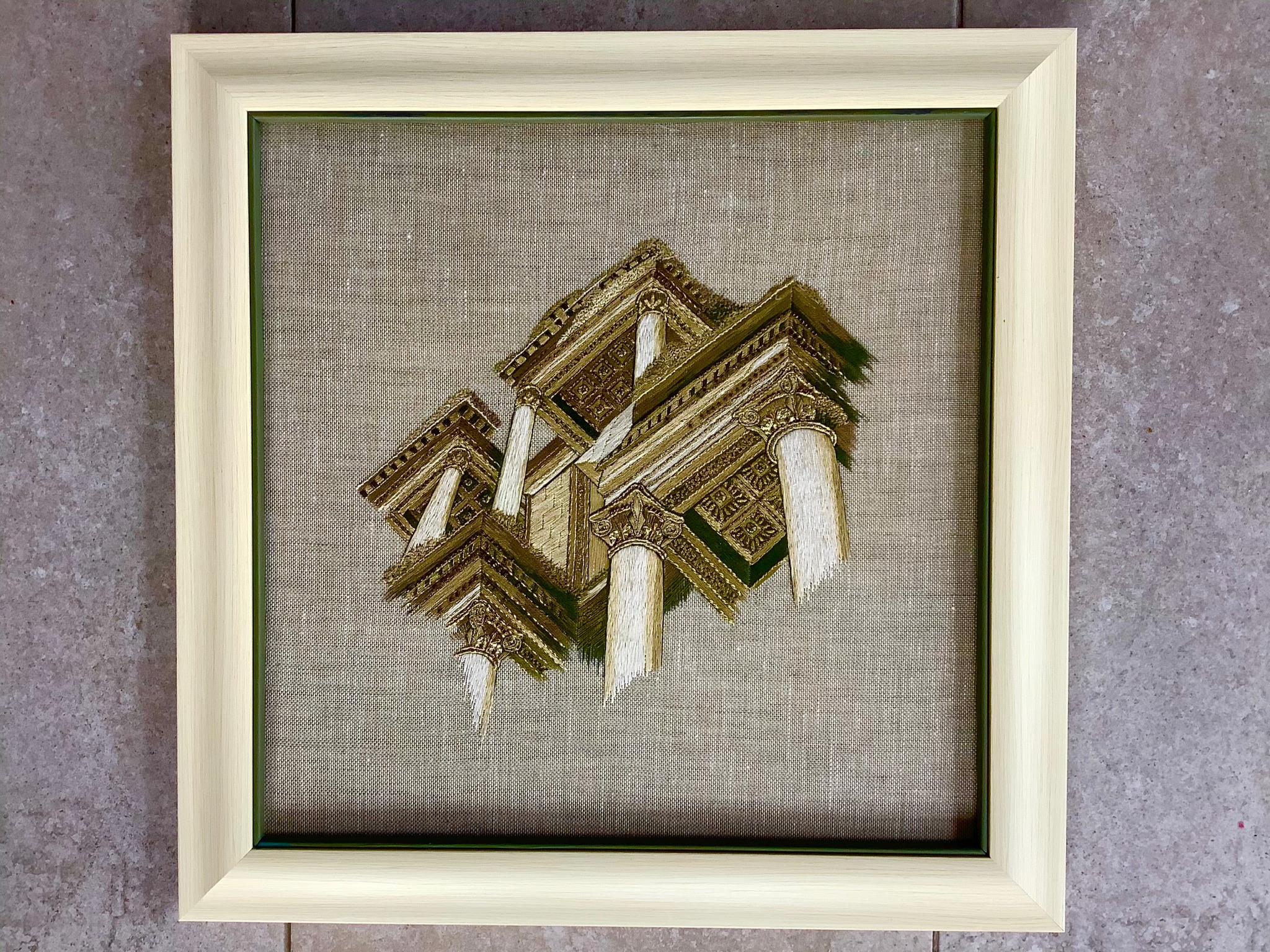 Out Standing is a work that was influenced by the year I spent at Gunby Hall and Gardens before my exhibition Temporal Echoes in the Orchard Gallery. During this time I was enveloped by the timeless atmosphere that it exudes when you visit. In one sense time has stood still, yet subtly natural changes happen as people interact with the place and its fabric. This work has evolved using my own photographic reference materials where I have deliberately chosen elements and shapes that evoke the specific as well as a universal sense of place in the world.