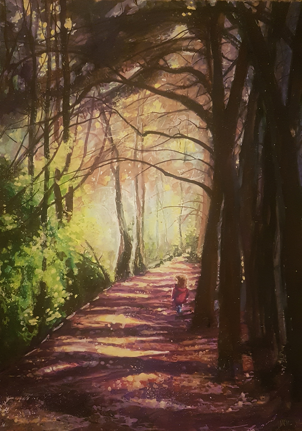 There was a mist but the sun was trying to shine through. Up ahead my daughter, in her red hooded coat was walking. Her face was filled with wonder, looking up, investigating the trees which towered above her. It reminded me to look at the world through a child’s eyes.