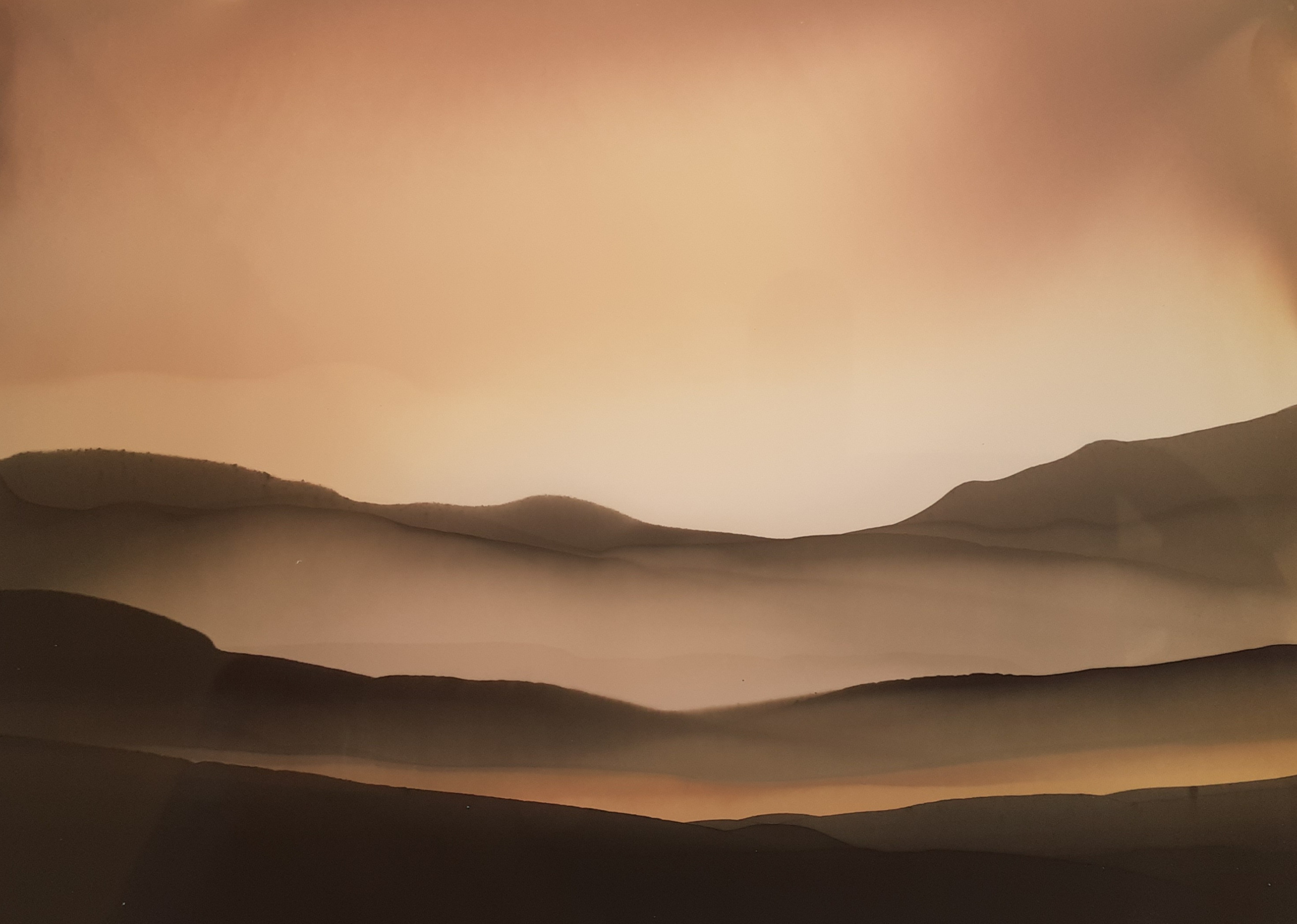 Fog rolling across the hills on a winter’s morning? In fact, Chemical Landscape is a completely fabricated place created by the reaction between chemicals on sensitized photographic paper. It is a photograph of light rather than a view that exists in reality, even so it still evokes a sense of place and atmosphere in me, triggering landscape memories. It was created using the chemigram process, where light sensitive paper is dipped between photographic developer and fixative. I made the developer myself combining herbs from the garden, washing soda and vitamin C powder for a more sustainable work.