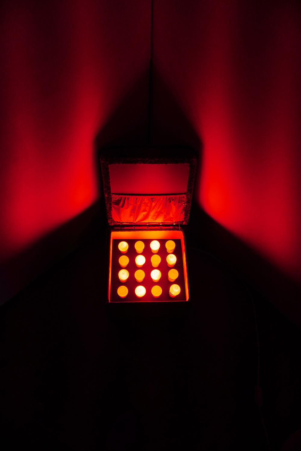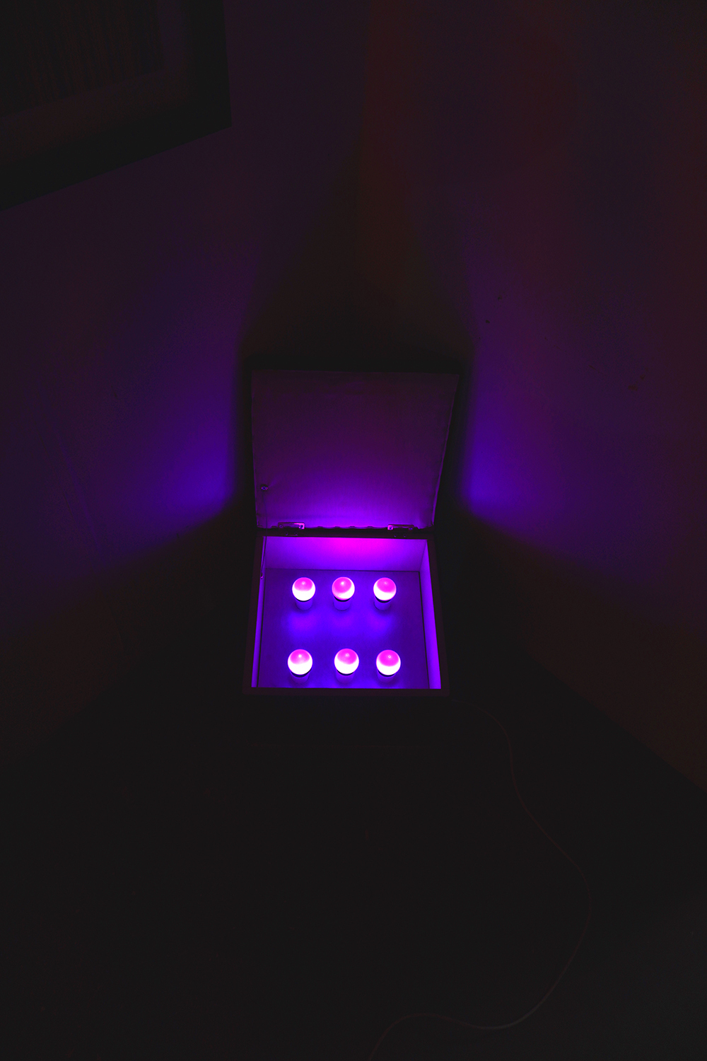 The two footstools that I modified have had multiple LED lights installed into the space where household objects would usually be kept. In this piece, light is a signifier for joy, excitement and new experiences. The footstool can also be closed as normal with no indication of any modification, this gives the piece more layers of possibility and can be altered as and when to play with the intentions of the piece. I invite viewers to interact and use the piece, both as it’s original intention, let them view it as an art object or both.