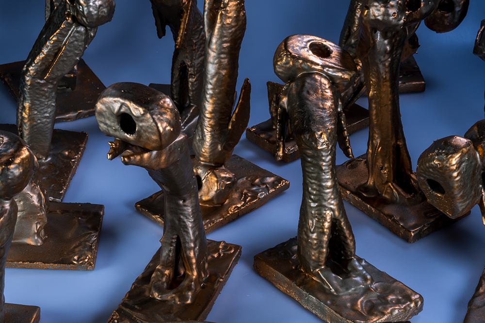 Foam, plaster, cellulose paint, and bronze flakes. Variable sizes, sculpture