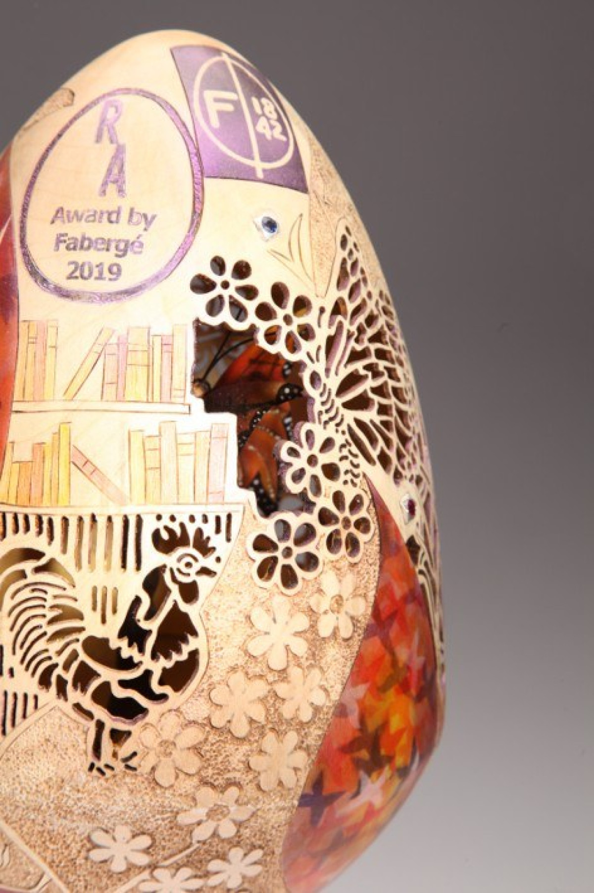 I get a lot of commissions. This is an egg that I made for Fabergé and it was given to chef Brian Turner. I did another one for the three generations of the Roux family