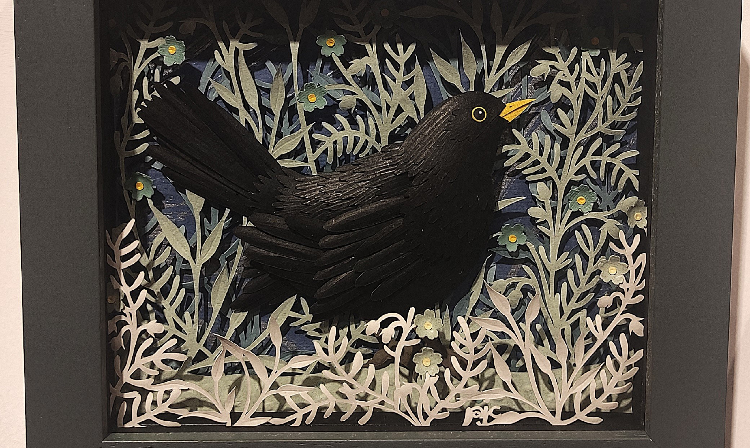The exhibition we are reviewing is “A Paper Tale” by Anna Cook, currently showing in the Ground Floor Gallery. She is a paper artist who creates intricate layered pieces, usually of woodland animals and birds, out of hand-cut and sculpted paper. She started creating these pieces in 2016 and is inspired by “an obsession with old botanical drawings and the beauty of the natural world” (Anna Cook, www.annacookpaperart.co.uk) which shows in her portrayal of these animals and plants.